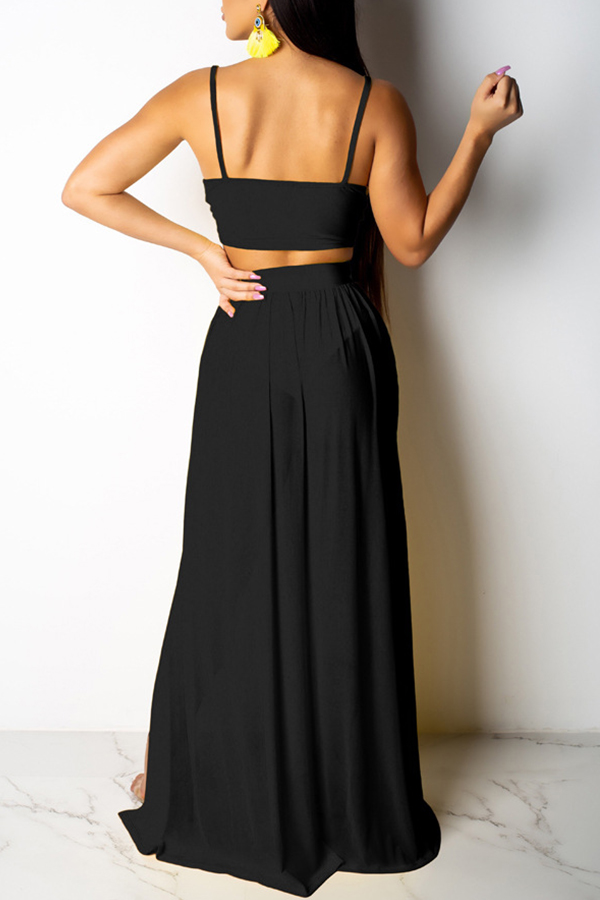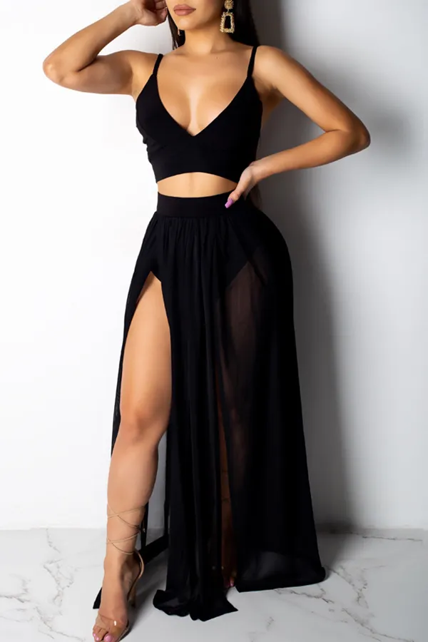 Home > Two Pieces > Lovely Casual Side High Slit Black Chiffon Two-piece Skirt Set