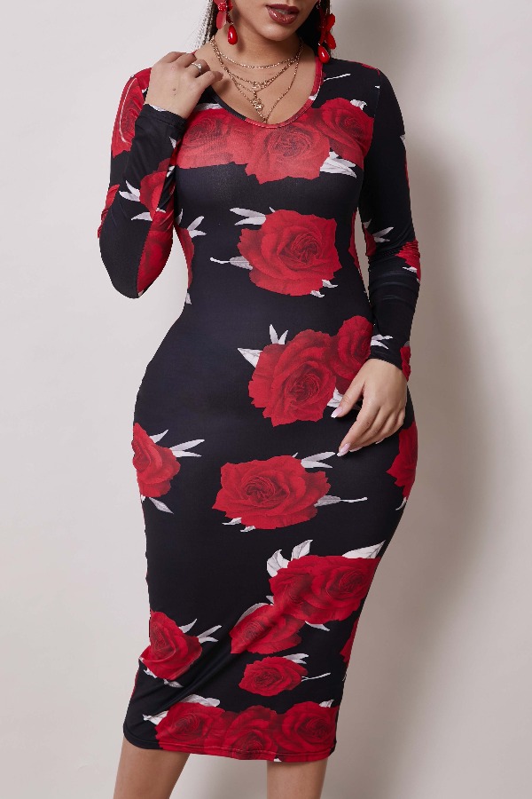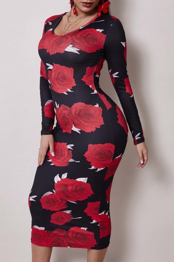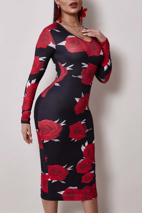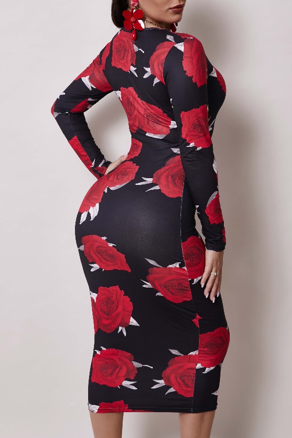Lovely Trendy O Neck Print Black Mid Calf Dress