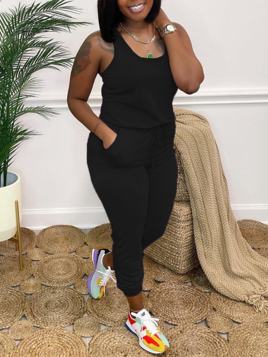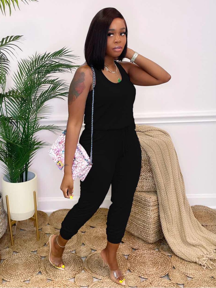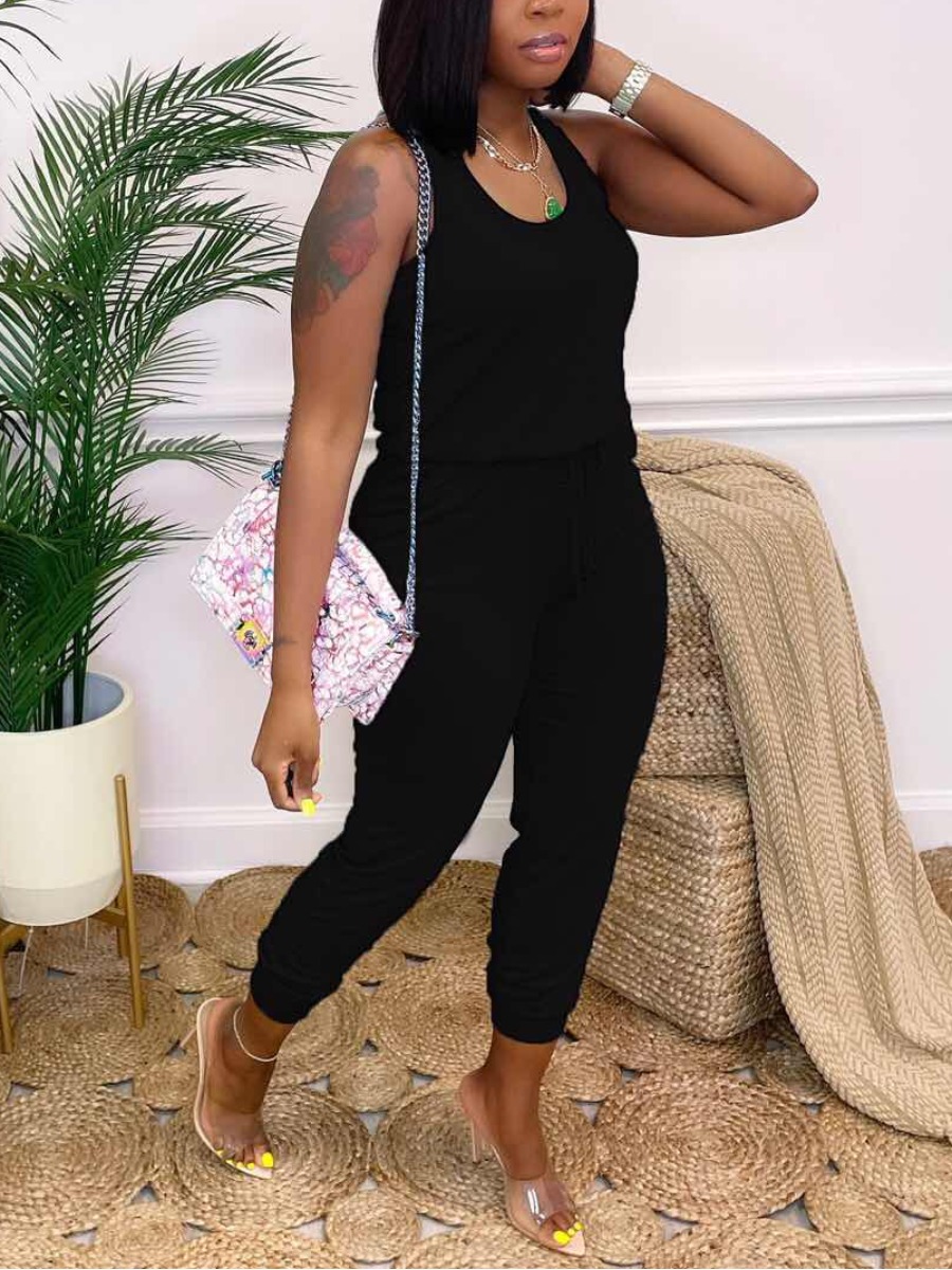 LW Casual U Neck Drawstring Black One-piece Jumpsu