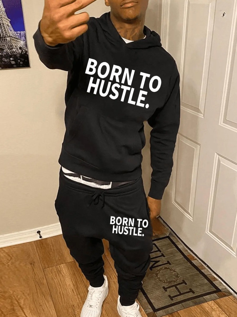Home > Men Clothes > Two Pieces > Two-piece Pants Set > LW Men Born To Hustle Letter Print Kangaroo Pocket Tracksuit Set