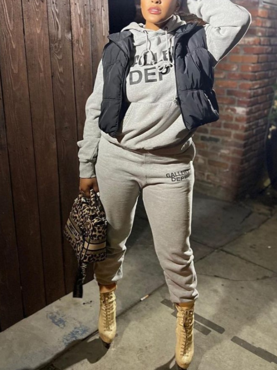 Home > Two Pieces > Two-piece Pants Set > LW Hooded Collar Slogan Graphic Kangaroo Pocket Tracksuit Set