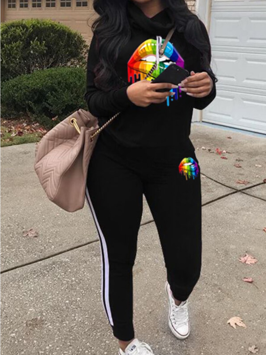 Home > Plus Size > Plus Size Two Pieces > Plus Size Two-piece Pants Set > LW Plus Size Hooded Collar Lip Print Striped Tracksuit Set