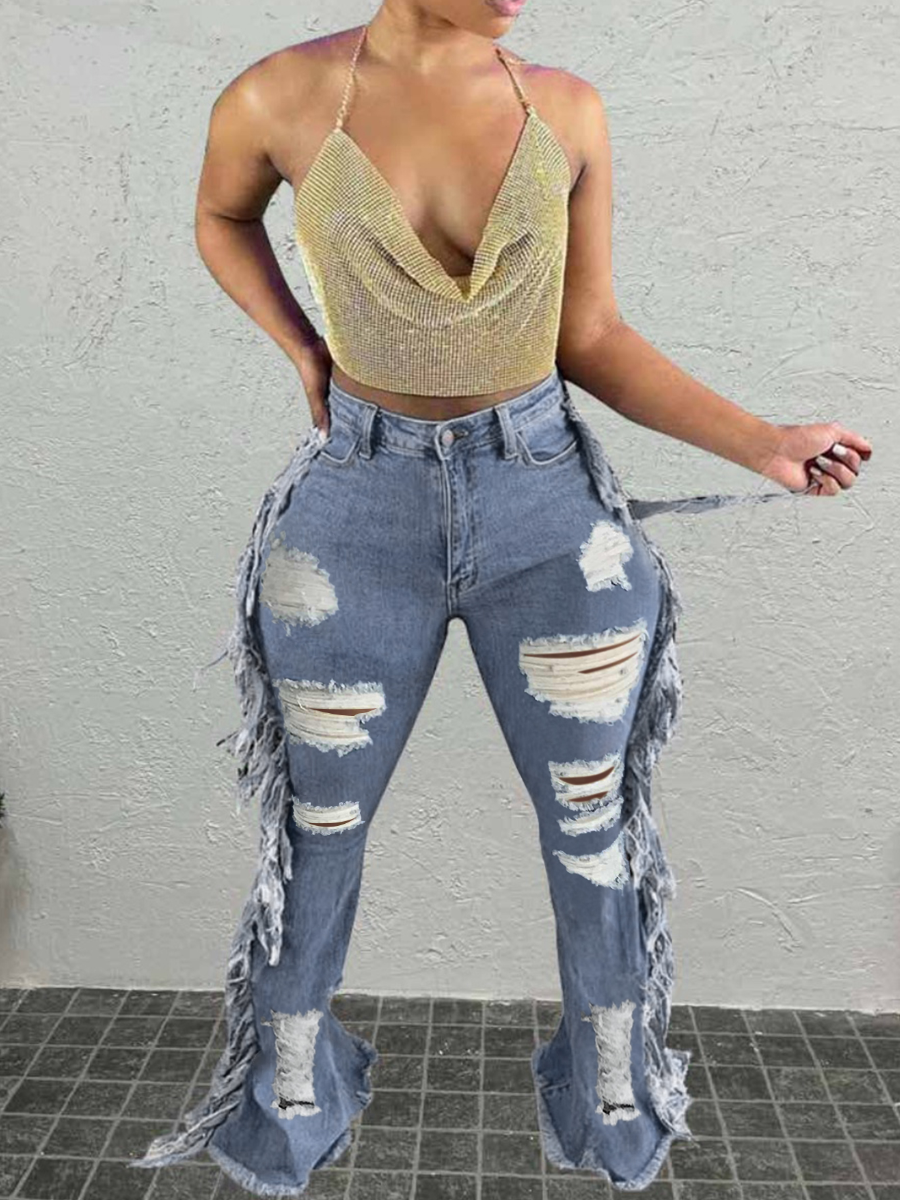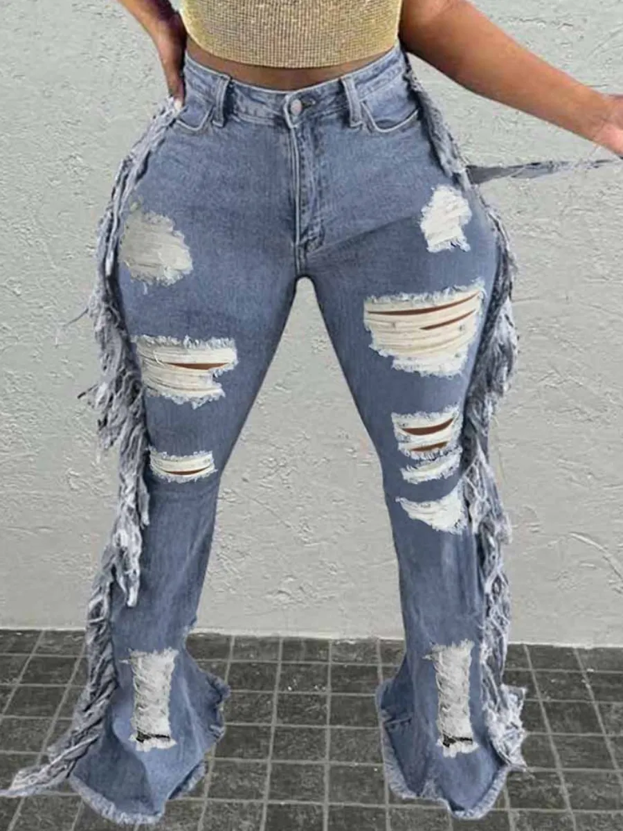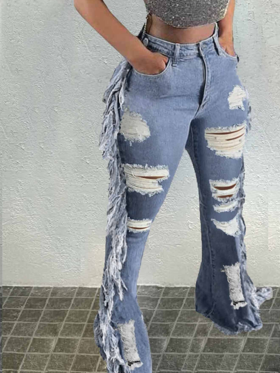LW High Waist Tassel Design Ripped Pocket Pierced Skinny Micro Elasticity Jeans