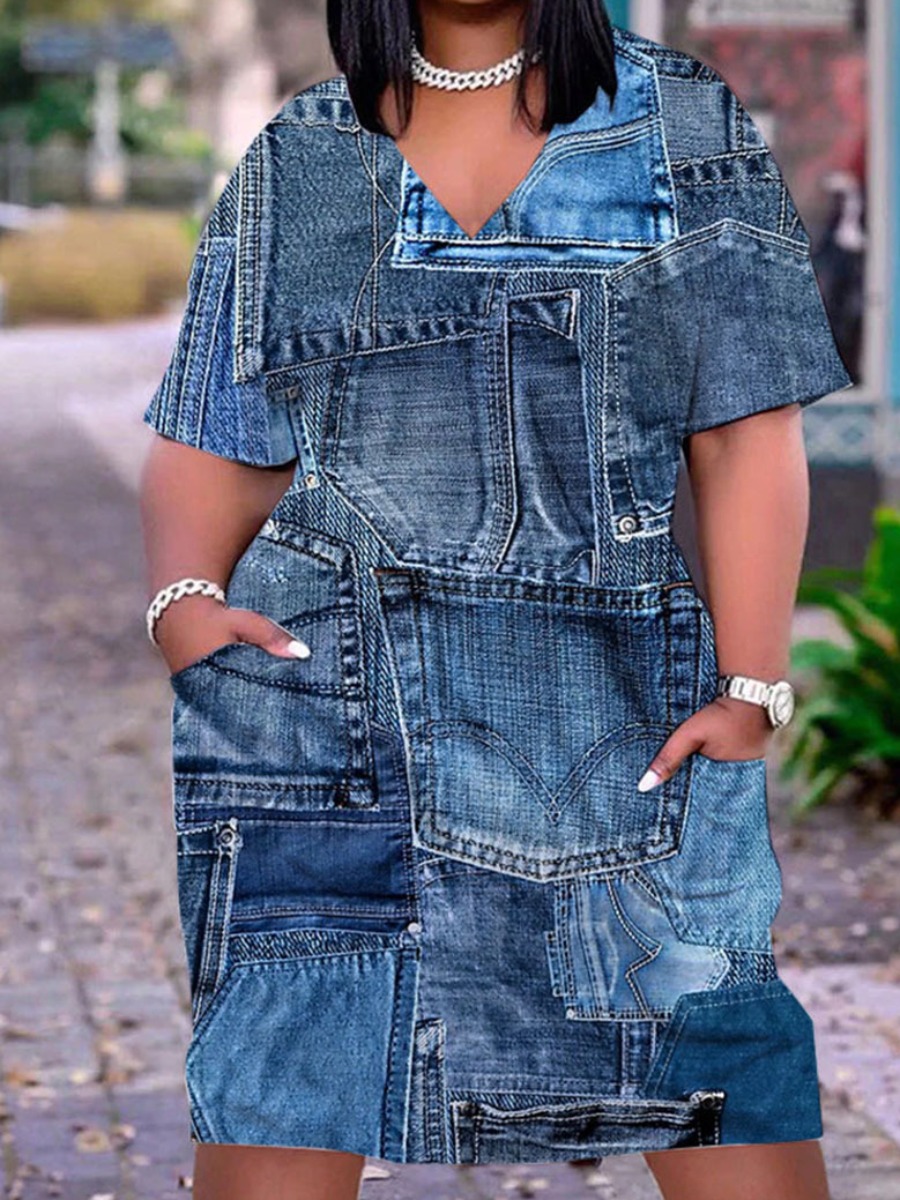 Home > Plus Size > Plus Size Dresses > Plus Size Dress > LW Plus Size Imitation Denim V Neck Pocket Design Dress