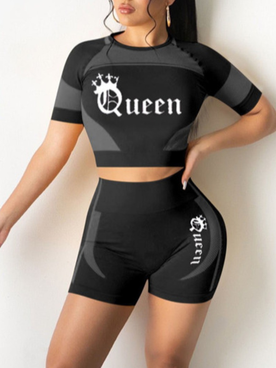 Home > Two Pieces > Two-piece Shorts Set > LW Crop Top Crown Queen Letter Print Shorts Set