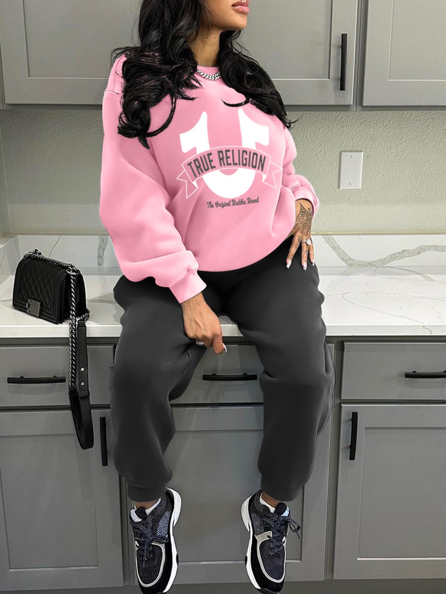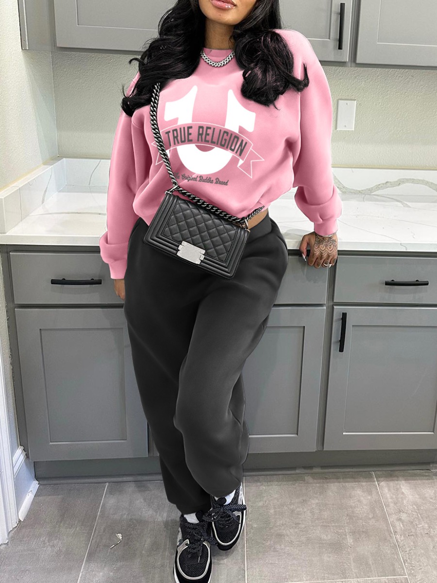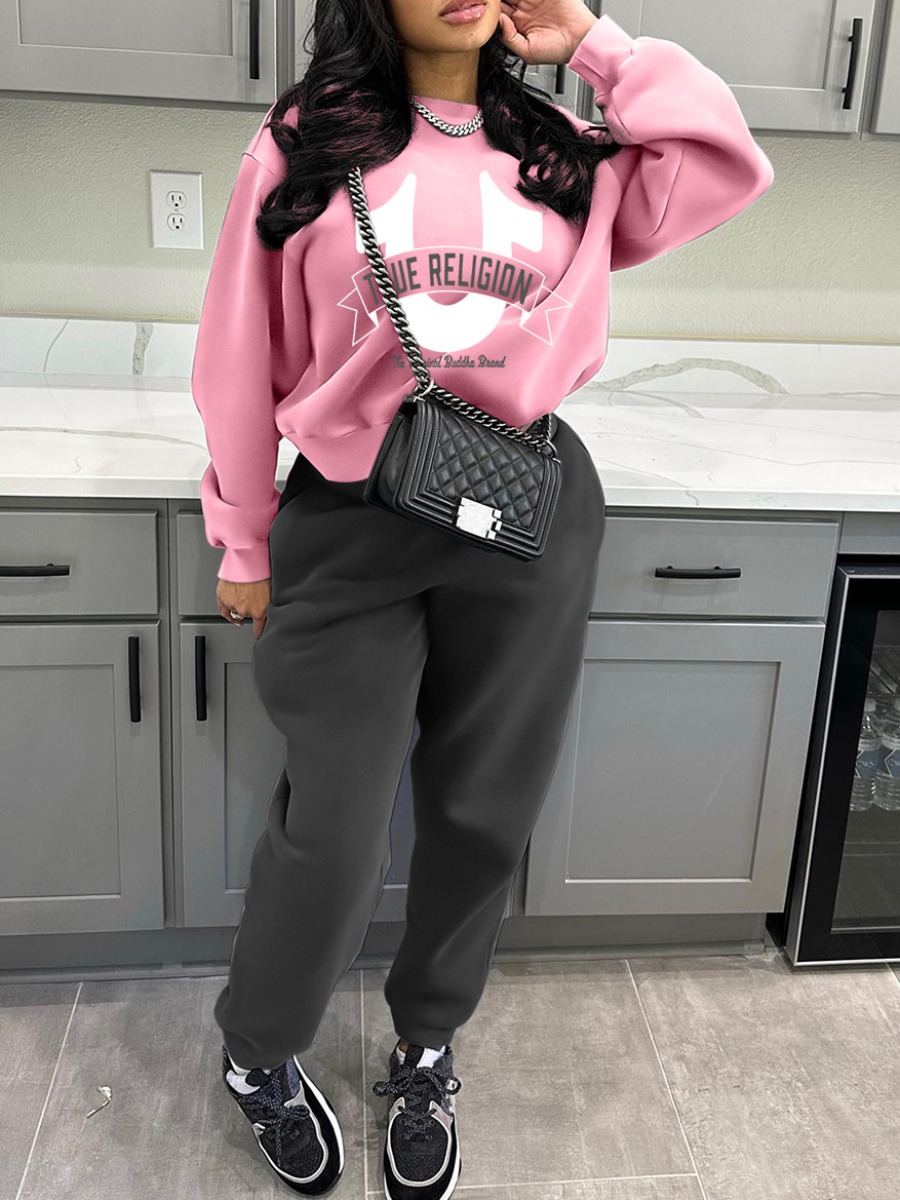 LW Casual Sweat Round Neck Pattern Letter Long Sleeve Two-piece Pants Set