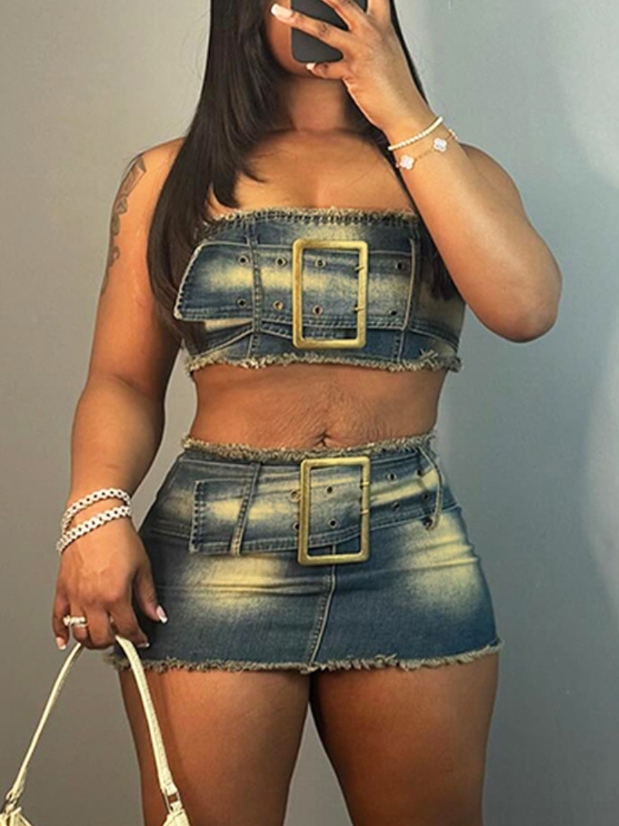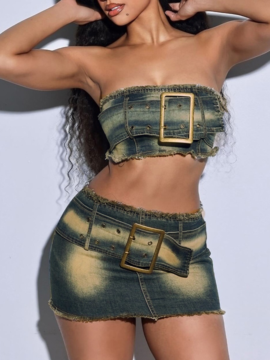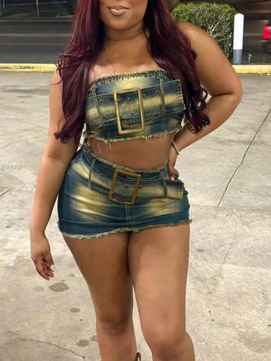 Home > Denim > Denim Two Pieces > LW Strapless Pattern Gradient Print Micro Elasticity Denim Two Pieces