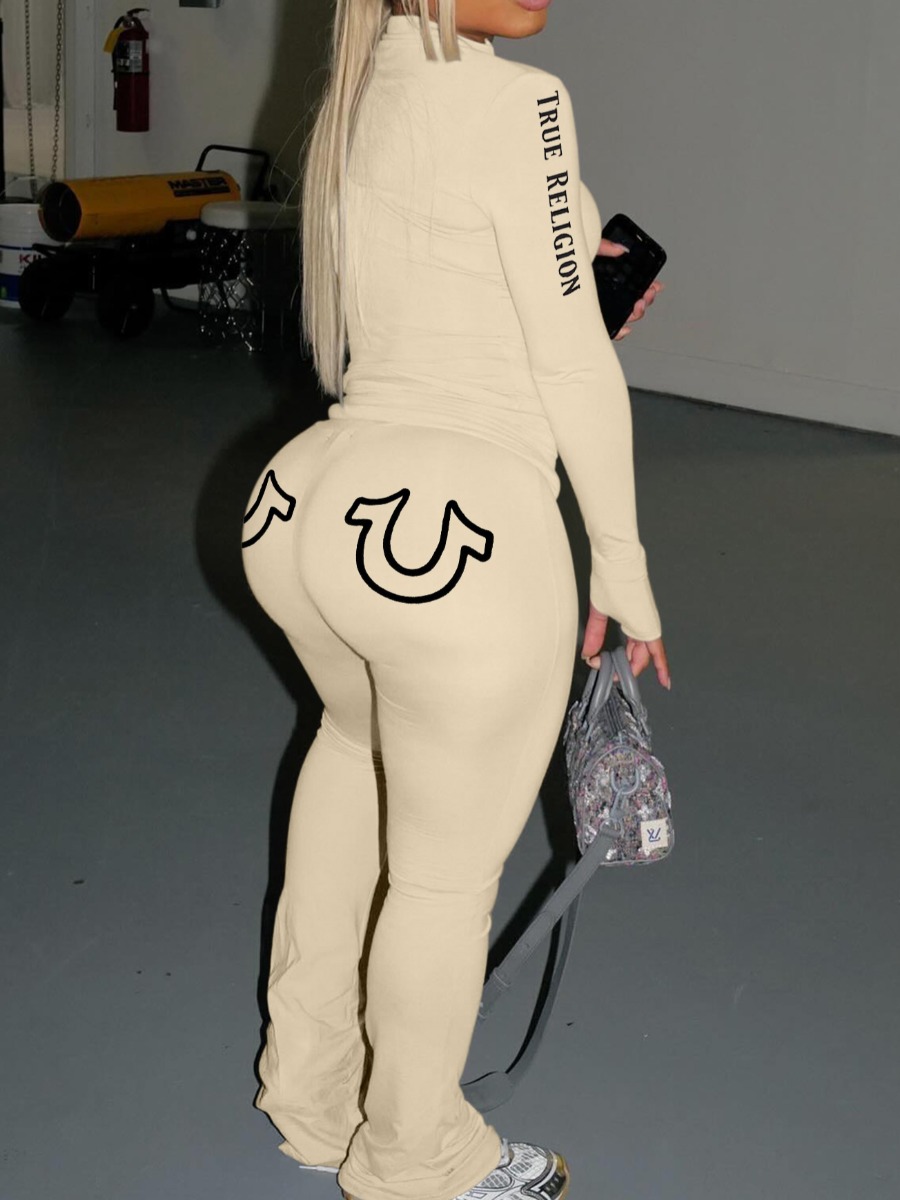 Home > Two Pieces > Two-piece Pants Set > LW Street Polyester Mock Neck Pattern Letter Geometric Long Sleeve Two-piece Pants Set