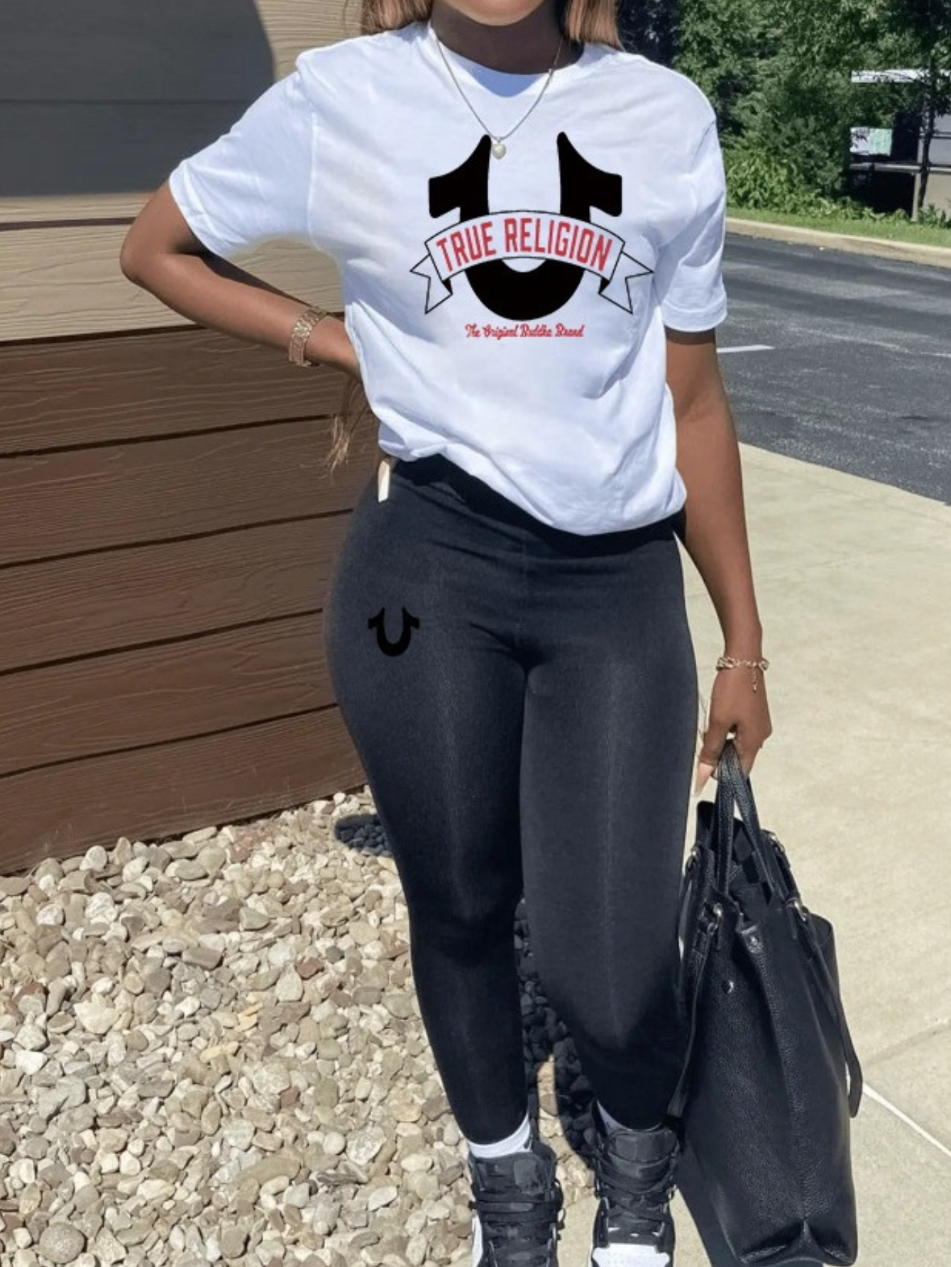 Home > Two Pieces > Two-piece Pants Set > LW Casual Polyester Round Neck Pattern Letter Short Sleeve Black And White Two-piece Pants Set