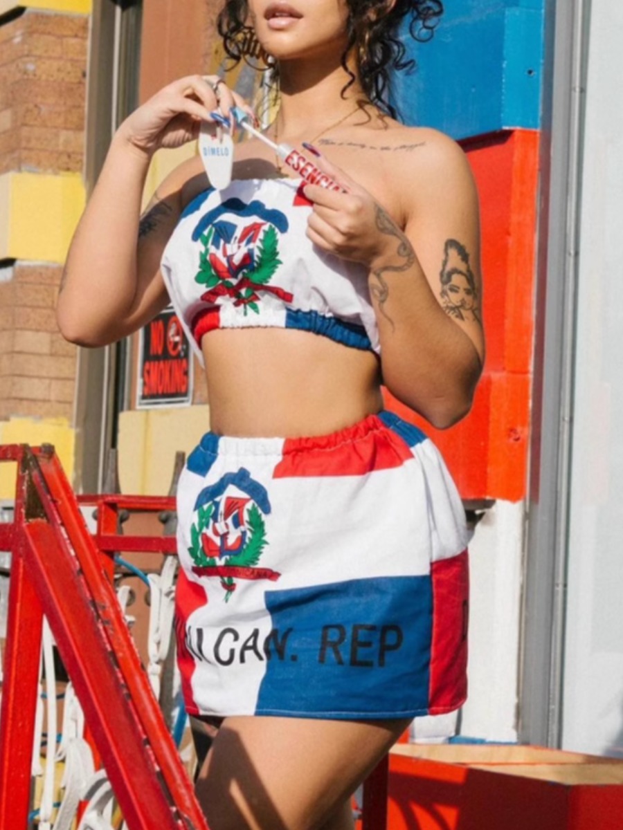 Home > Two Pieces > Two-piece Skirt Set > LW Casual Polyester Strapless Pattern Color Block Sleeveless Two-piece Skirt Set