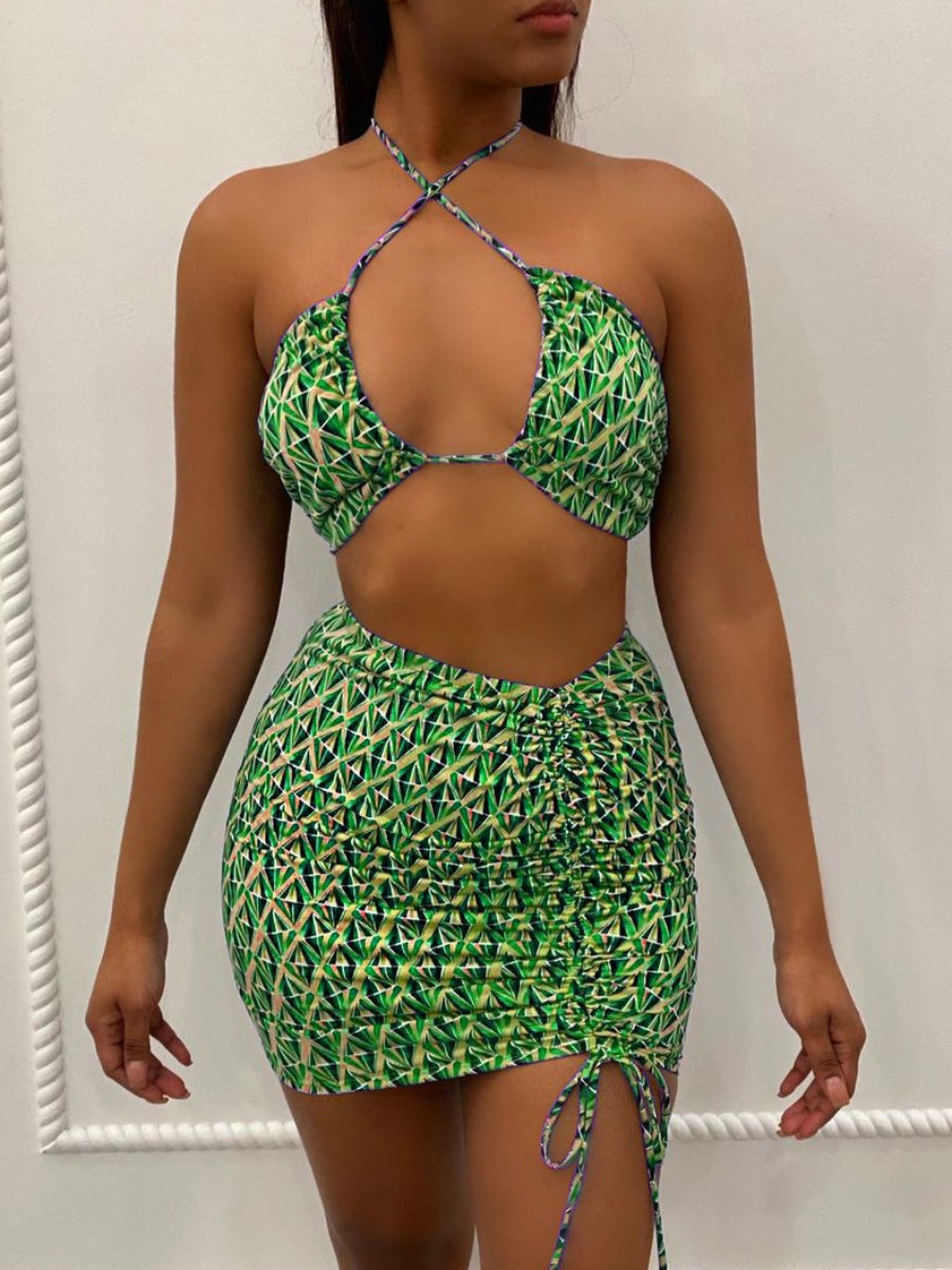 Home > Two Pieces > Two-piece Skirt Set > LW SXY Sxy Polyester Halter Drawstring Geometric Pattern Sleeveless Two-piece Skirt Set