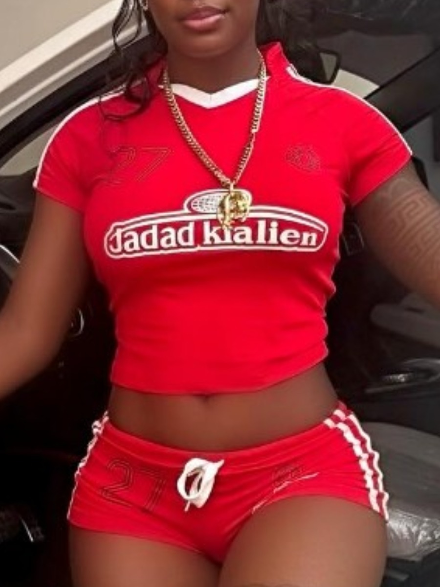 Home > Two Pieces > Two-piece Shorts Set > LW Sporty Polyester Mandarin Collar Pattern Mixed Print Letter Short Sleeve Two-piece Shorts Set