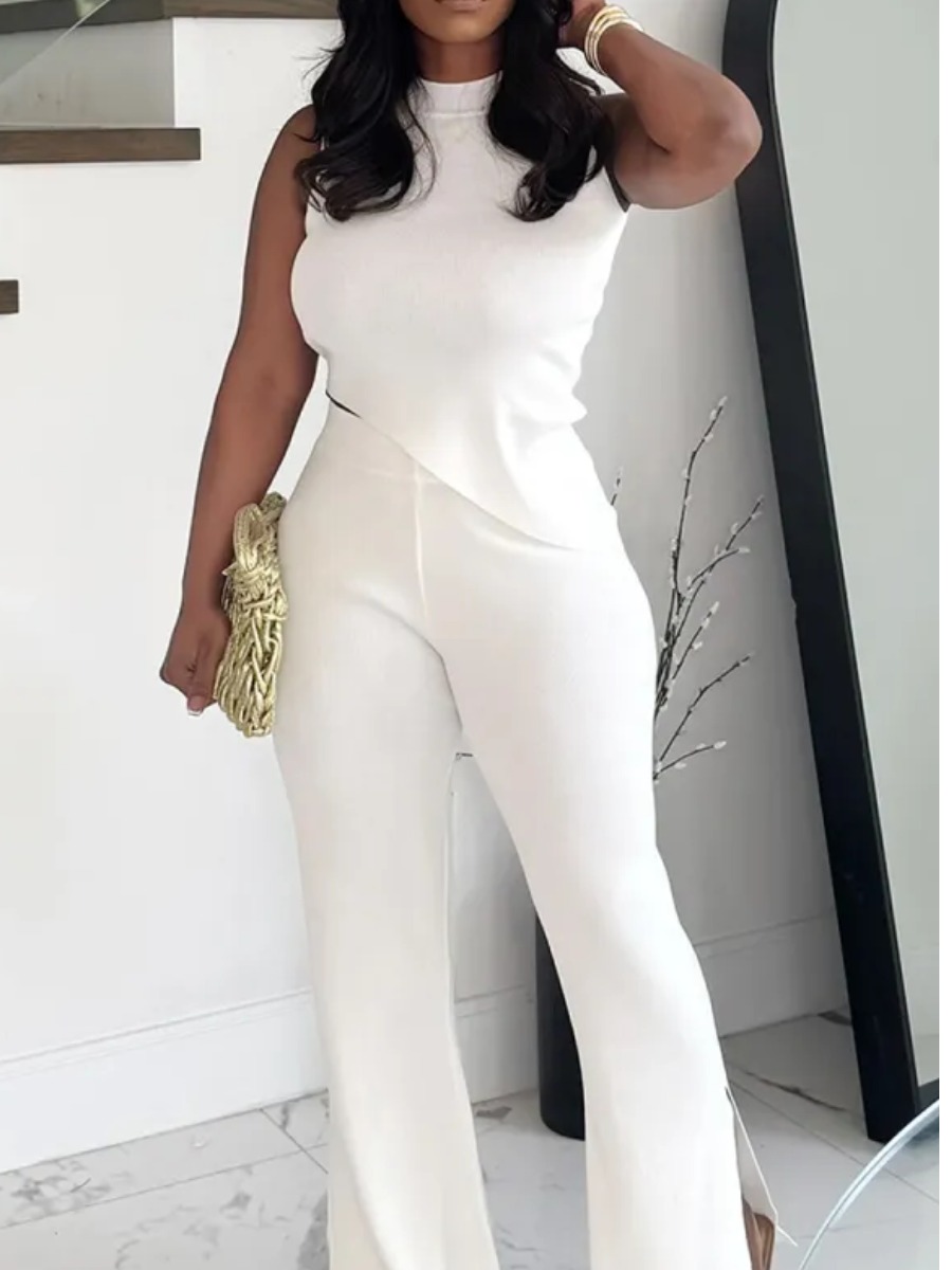 Home > Two Pieces > Two-piece Pants Set > LW Casual Polyester Mock Neck Asymmetrical Solid Color Sleeveless Two-piece Pants Set