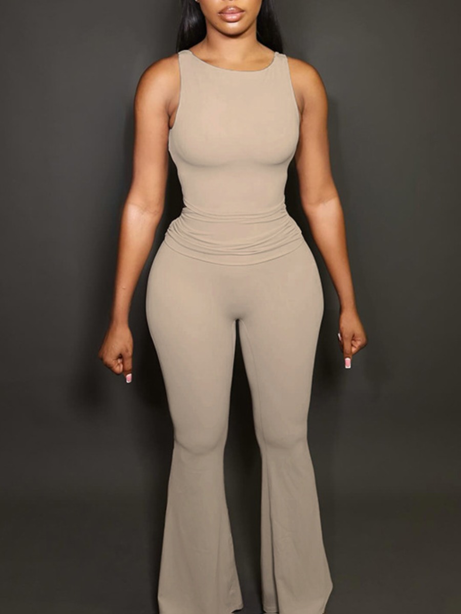 Home > Two Pieces > Two-piece Pants Set > LW BASICS Casual Polyester U Neck Solid Color Sleeveless Two-piece Pants Set