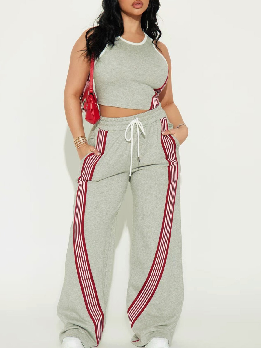 Home > Two Pieces > Two-piece Pants Set > LW Casual Polyester Round Neck Bandage Design Striped Sleeveless Two-piece Pants Set