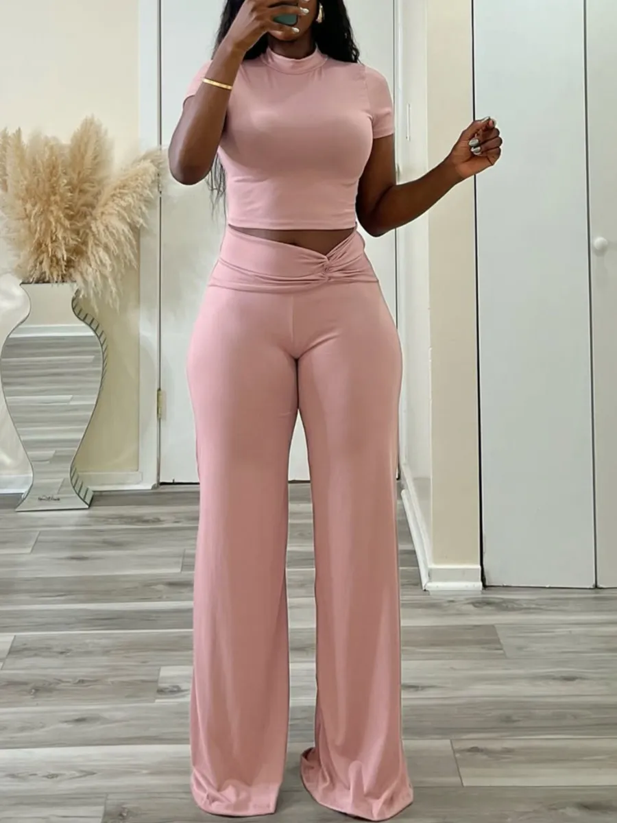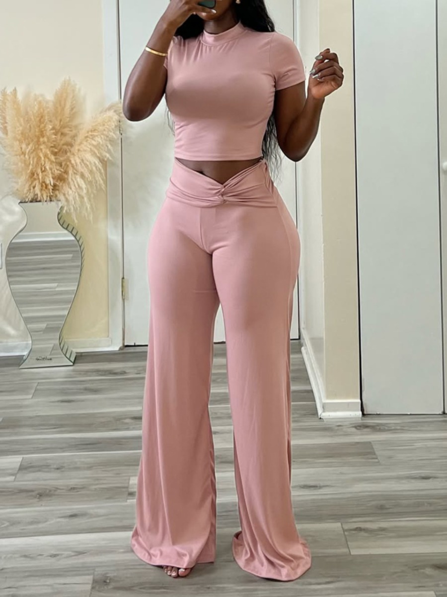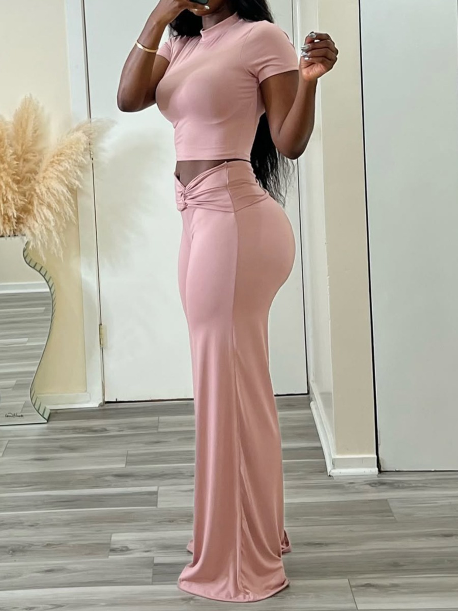 Home > Two Pieces > Two-piece Pants Set > LW BASICS Casual Polyester Round Neck Knot Solid Color Short Sleeve Two-piece Pants Set