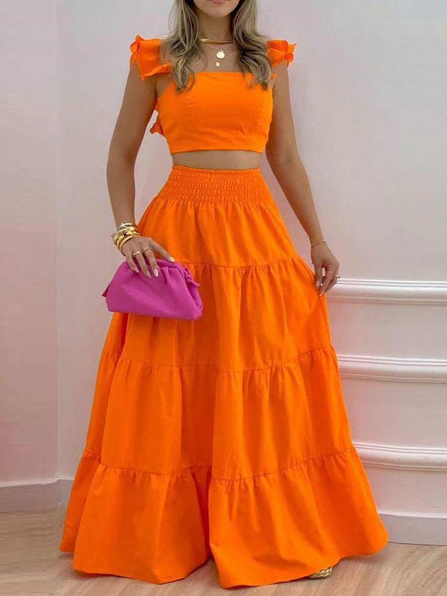 Home > Two Pieces > Two-piece Skirt Set > LW Vacation Polyester Square Collar Solid Color Sleeveless Two-piece Skirt Set