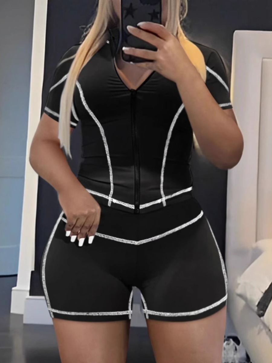 Home > Two Pieces > Two-piece Shorts Set > LW BASICS Casual Polyester Round Neck Solid Color Contrast Short Sleeve Two-piece Shorts Set