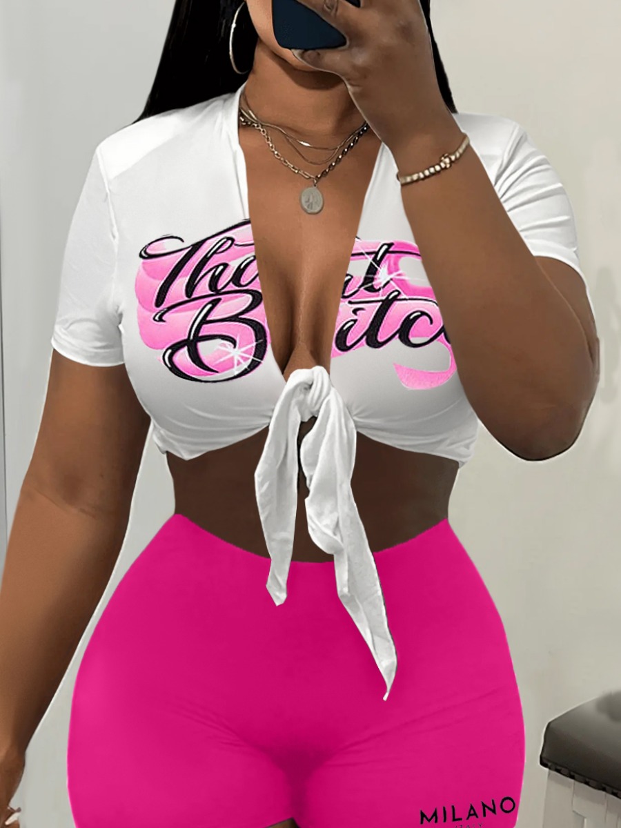 Home > Two Pieces > Two-piece Shorts Set > LW Street Polyester Collarless Pattern Letter Short Sleeve Two-piece Shorts Set