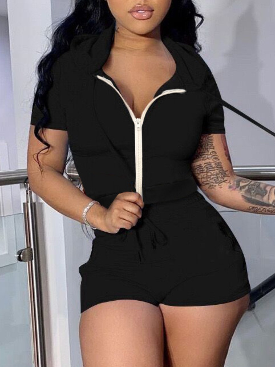 Home > Two Pieces > Two-piece Shorts Set > LW BASICS Casual Polyester Hooded Collar Zipper Design Solid Color Short Sleeve Two-piece Shorts Set