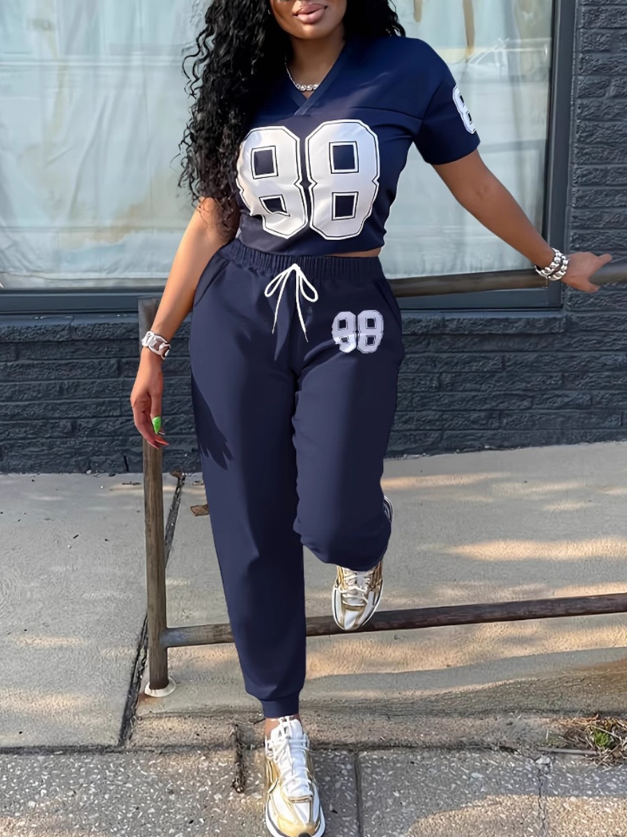 Home > Two Pieces > Two-piece Pants Set > LW Sporty Polyester V Neck Pattern Waist Bandage Geometric Short Sleeve Two-piece Pants Set