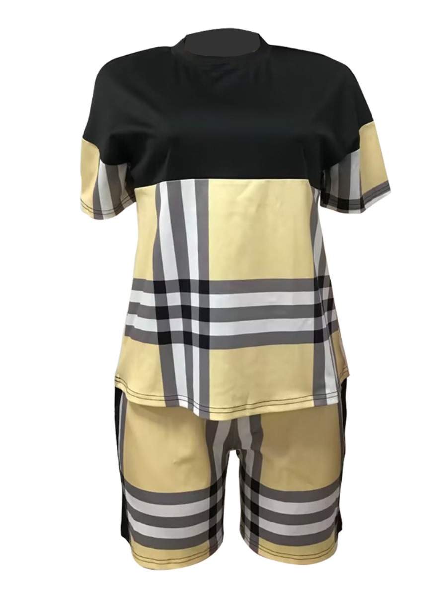 Home > Two Pieces > Two-piece Shorts Set > LW Casual Polyester Round Neck Patchwork Plaid Short Sleeve Two-piece Shorts Set
