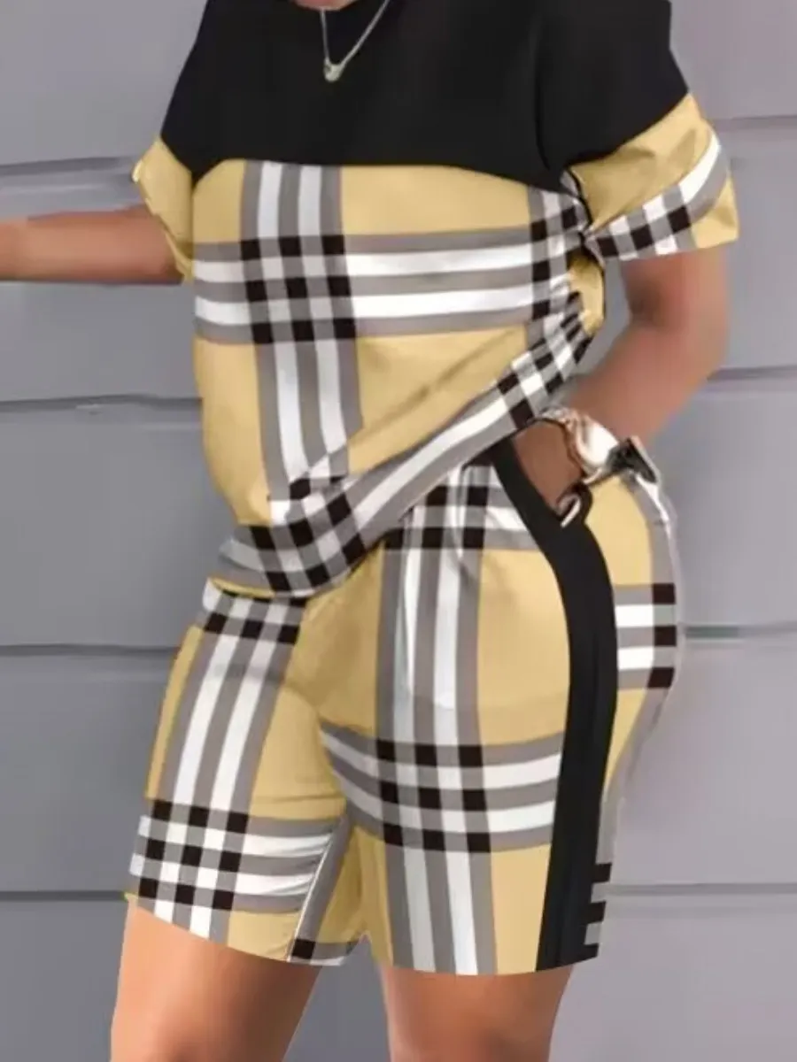 LW Casual Polyester Round Neck Patchwork Plaid Short Sleeve Two-piece Shorts Set