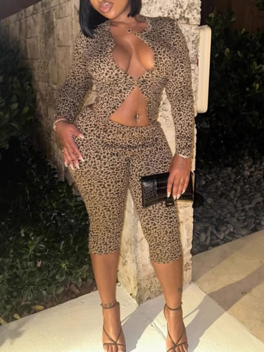 Home > Two Pieces > Two-piece Pants Set > LW SXY Sxy Polyester Round Neck Pattern Leopard Print Long Sleeve Leopard Two-piece Pants Set