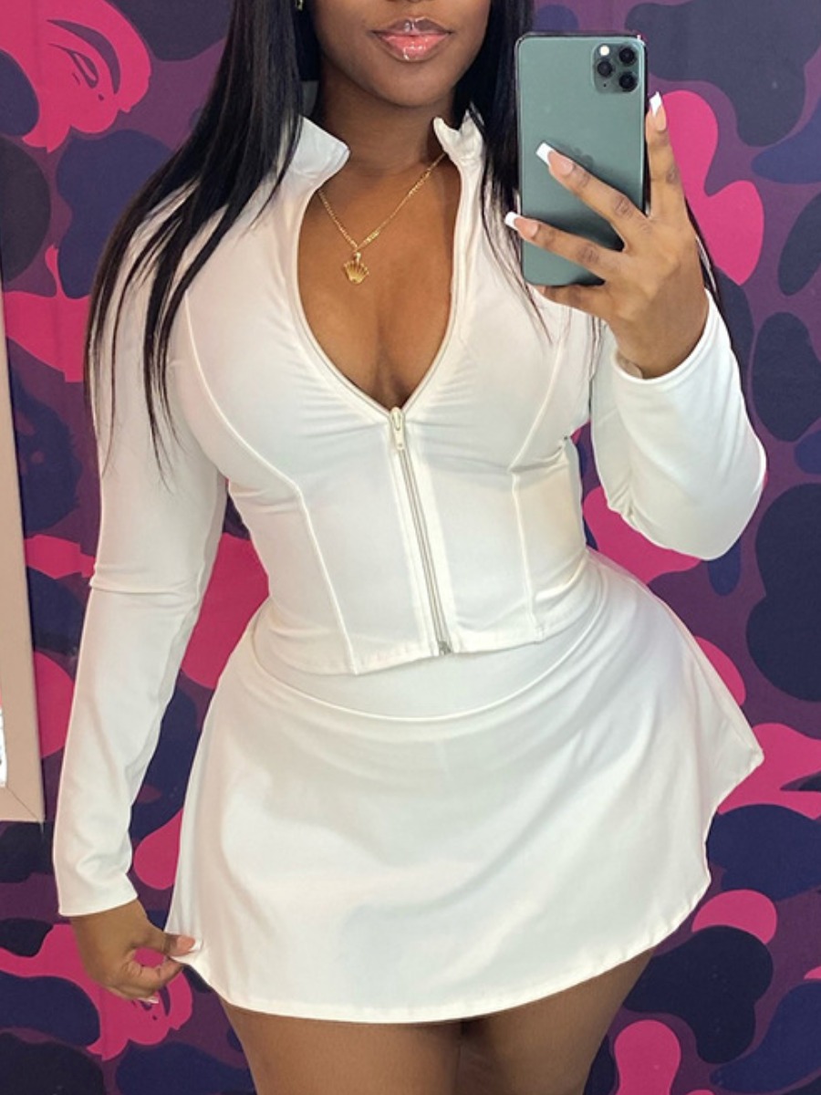 Home > Two Pieces > Two-piece Skirt Set > LW BASICS Casual Polyester Round Neck Zipper Design Solid Color Long Sleeve Two-piece Skirt Set