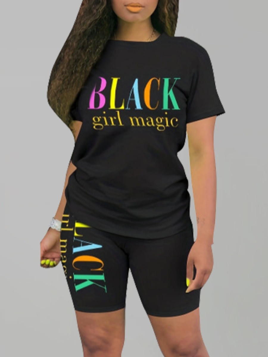 Home > Two Pieces > Two-piece Shorts Set > LW Casual Polyester Round Neck Pattern Letter Short Sleeve Two-piece Shorts Set