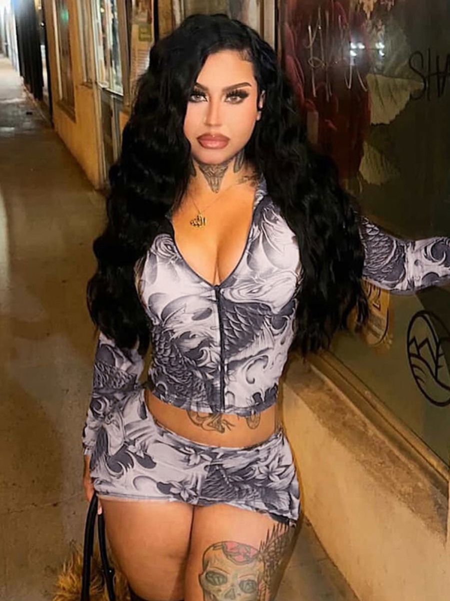 Home > Two Pieces > Two-piece Shorts Set > LW Street Round Neck Zipper Design Mixed Print Long Sleeve Two-piece Shorts Set