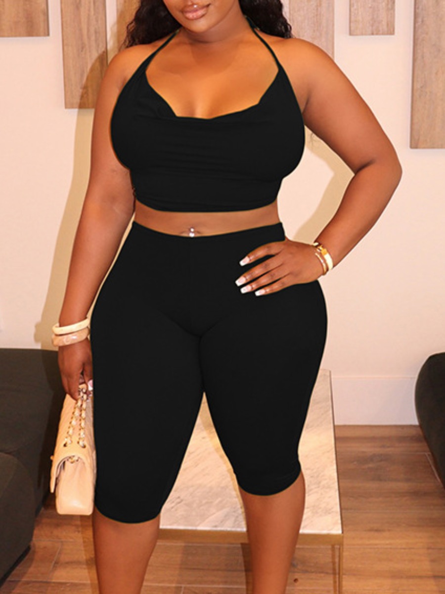 Home > Two Pieces > Two-piece Pants Set > LW BASICS Casual Polyester Halter Solid Color Sleeveless Two-piece Pants Set
