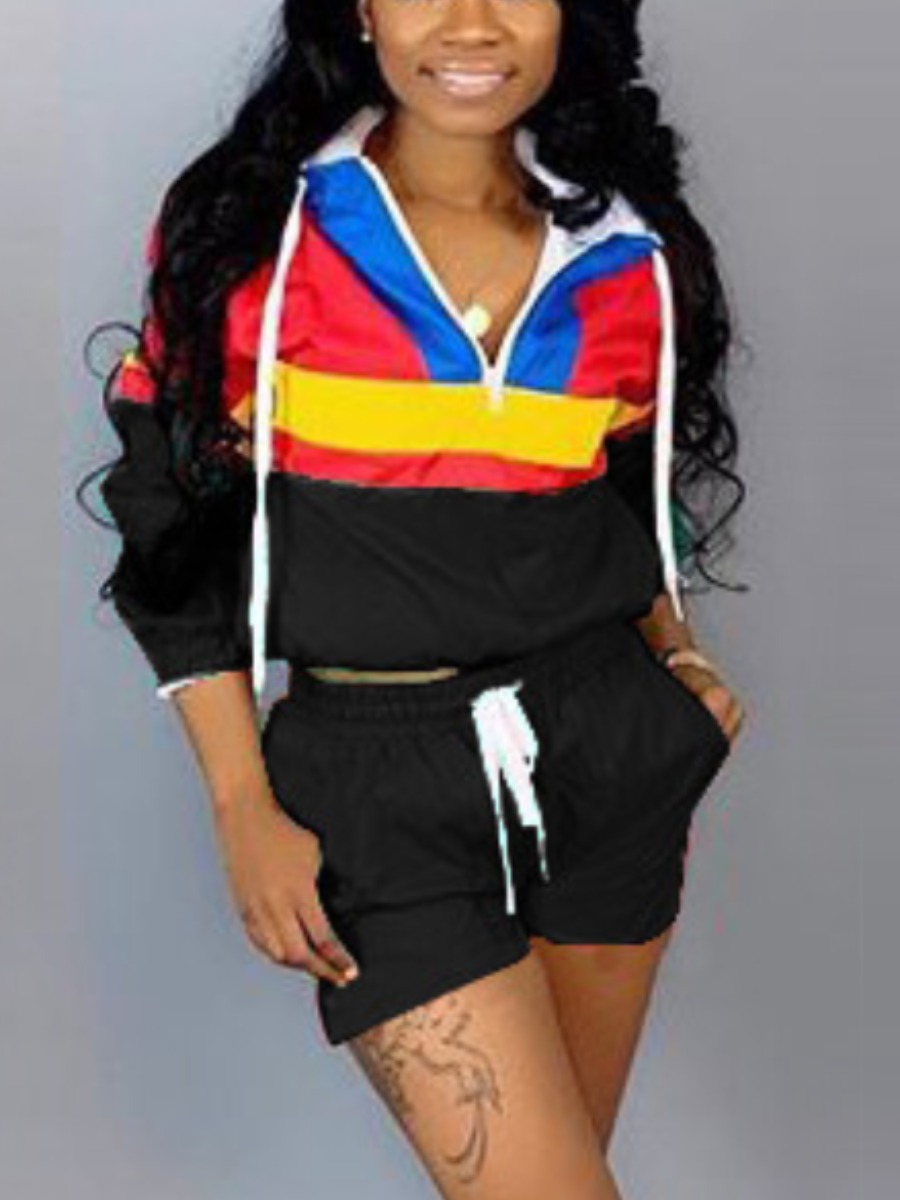 Home > Two Pieces > Two-piece Shorts Set > LW Casual Polyester Hooded Collar Color Block Contrast Long Sleeve Two-piece Shorts Set