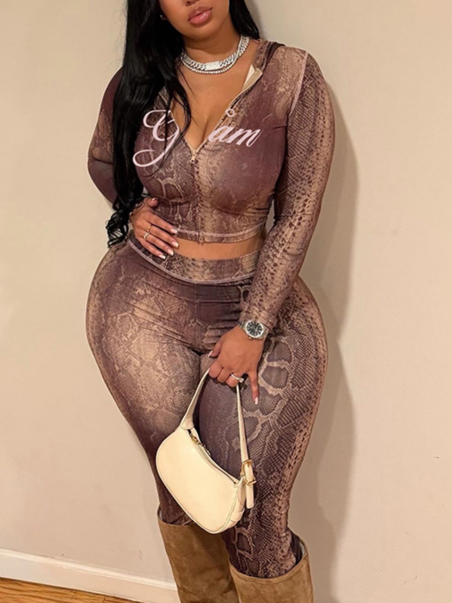 Home > Two Pieces > Two-piece Pants Set > LW SXY Sxy Polyester Hooded Collar Pattern Animal Print Letter Long Sleeve Cobra Two-piece Pants Set