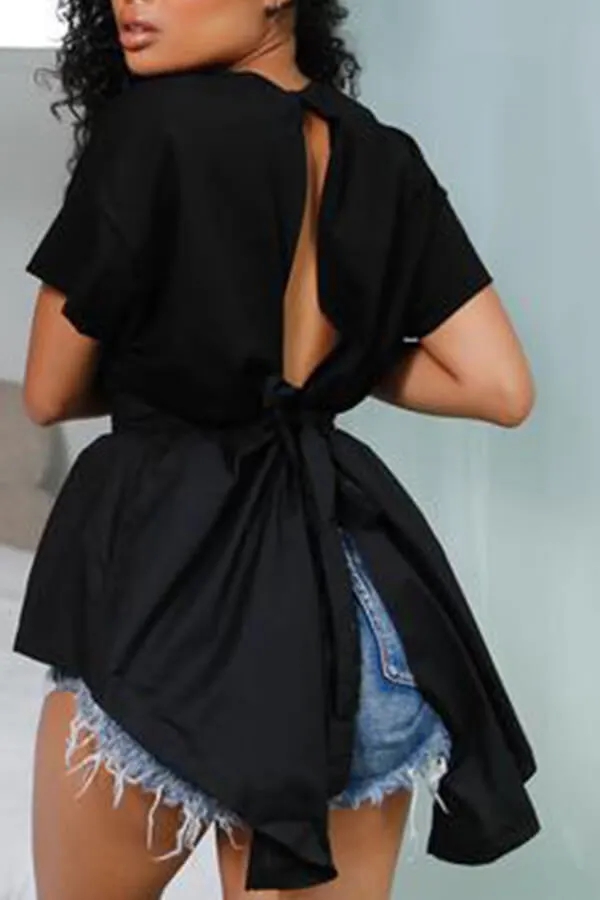 Home > Tops > Shirt > Lovely Trendy Round Neck Irregular Design Drawstring Black Cotton Shirts